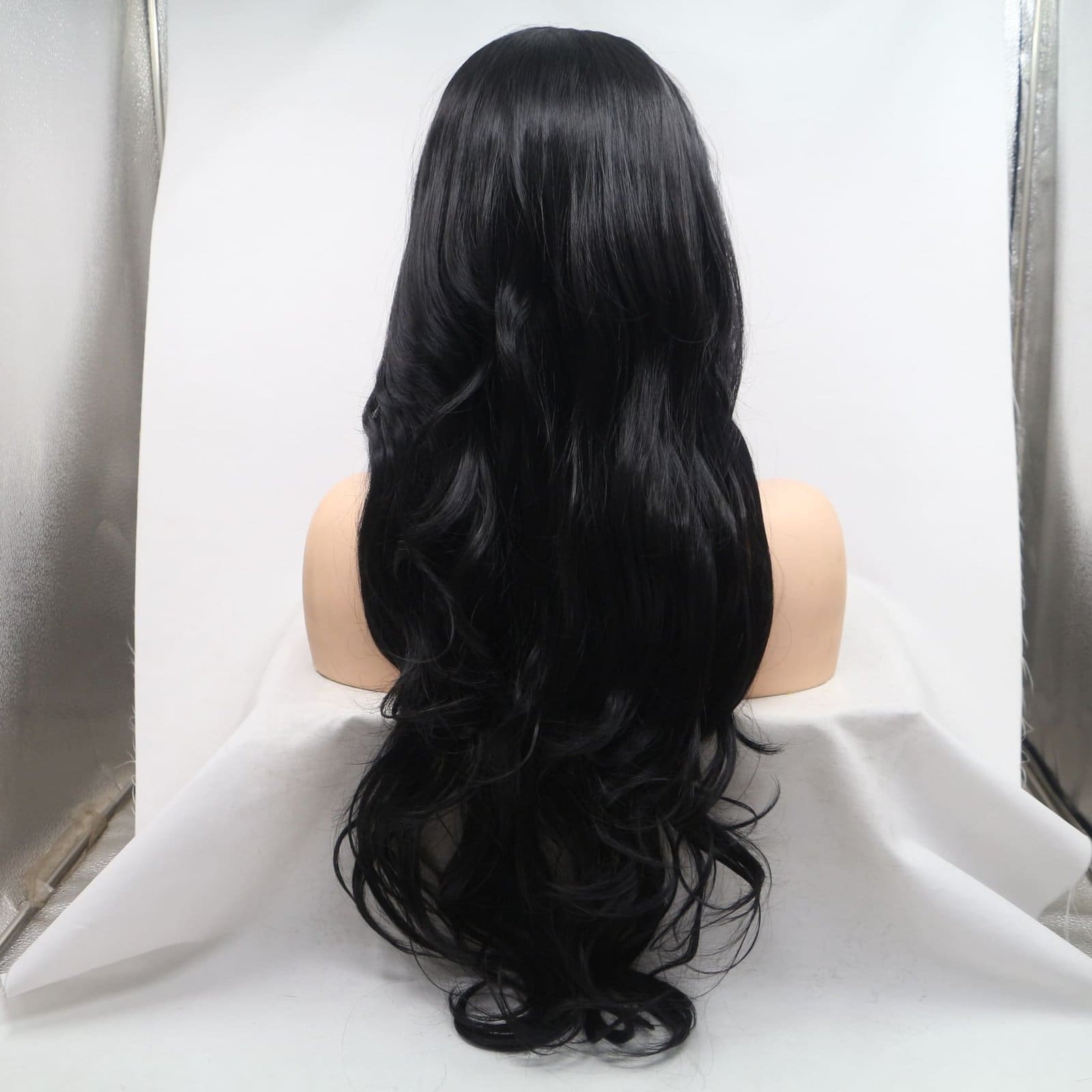 0085 Machine Made Long Wave Synthetic Wig – 24 Inch Midsection Natural Black Wave, High Quality Matte Heat Resistant Fiber, No Plastic Gloss
