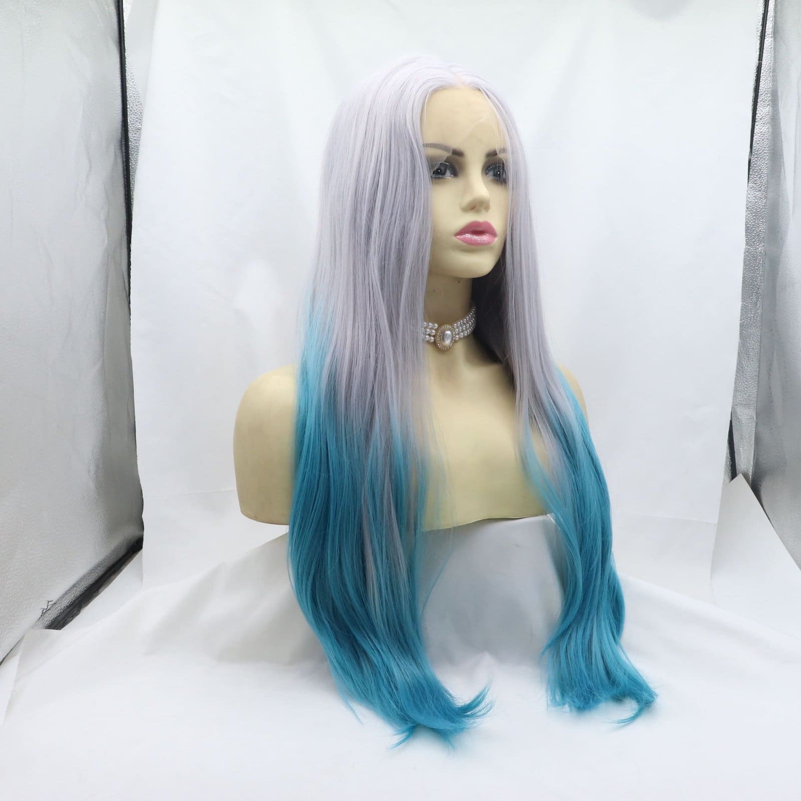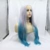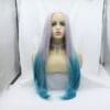 Made from premium high-temperature resistant synthetic fiber (high-heat silk), the hair delivers a silky-smooth, low-shine texture that’s soft, durable, and lifelike. The eye-catching dual-tone gradient shifts from soft ash gray/lilac roots to vibrant teal/blue tips, offering dimensional, mermaid-like color that catches light beautifully and stands out without looking artificial.