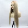 Product Overview: The NC-UltraGold represents the pinnacle of cross-border e-commerce luxury. This unit is upgraded with a massive 13*6 large-area hand-hooked lace front, providing the deepest and most realistic parting space available on the market. Featuring a stunning gradient transition from natural roots to a luminous gold, this “Full Headgear” is styled in a bone-straight texture with a “naturally fluffy” root lift. It is the ultimate choice for European and American customers seeking a high-end, undetectable salon finish.